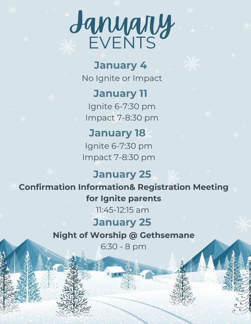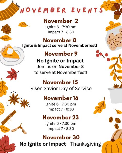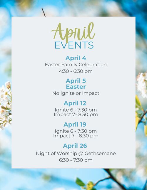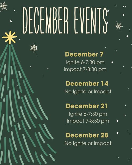 Ignite meets Sundays in the North Building Room 107 from 6:00 - 7:30 pm.
