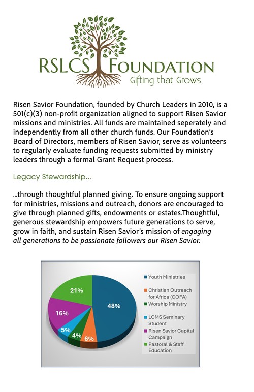 - The Foundation continues to offer support for a LCMS Seminary student, a member of Risen Savior.