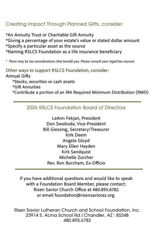 - Gifts of cash, a heartfelt annual gift to bless Risen Savior Ministries
