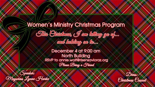All women are invited to the Women’s Ministry Christmas Program! There will be special music, breakfast breads and spreads from Barrio and coffee. Along with multiple authors on-site for book signings. Cost to attend is two dozen stocking stuffer items for boys and girls ages 8-12. Don't forget to RSVP!